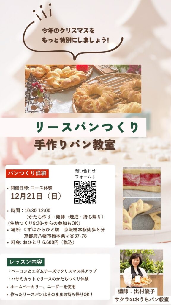 (受講料)体験受講6.600円(税込)12月21日(日)がコース体験リースパンつくりの最終日となります。