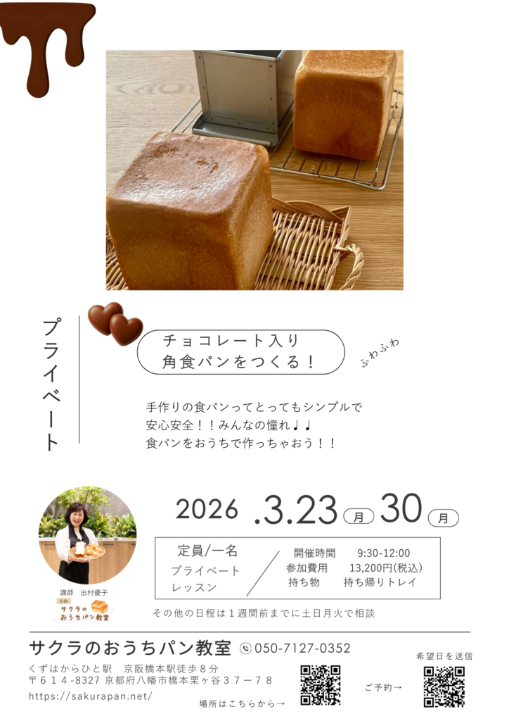 - ▶️フタ付き食パンプライベートレッスン3月チョコレート入り角食パン(月)