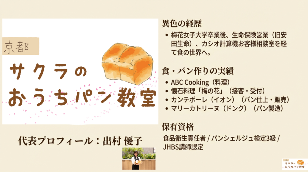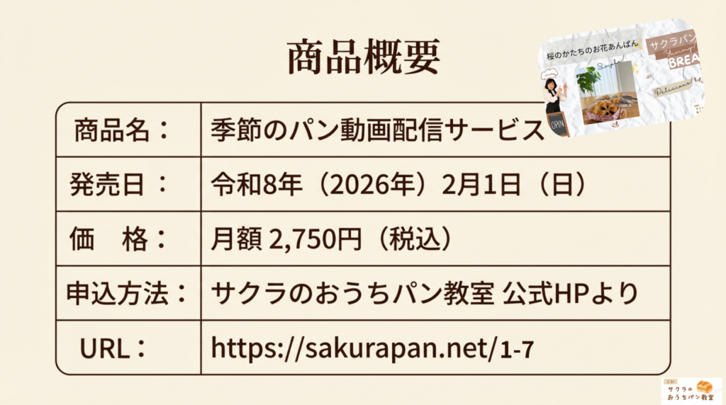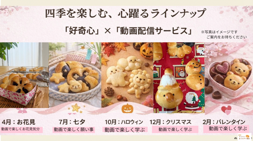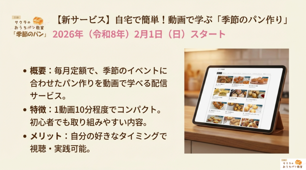 ▶️笑顔と絆をつくる、新しいパン作りのカタチ 新サービスカリキュラムのご案内 2026 1/31 ニュース レッスン紹介 2026年1月31日 ↓↓↓クリック あわせて読みたい サブスクリプションご購入ページ サブスクリプションご購入ページ サブスクリプションご利用方法について サブスクリプションご利用方法はこちら 【ご新規 季節のパン動画コース】2750円(新規会員登録の... ニュース レッスン紹介 よかったらシェアしてね! URLをコピーしました! URLをコピーしました! ▶️プレスリリースの様子が、商工会youtubeで公開されました!こちらから 関連記事 ▶️プレスリリースの様子が、商工会youtubeで公開されました!こちらから 2026年1月31日 ▶️2026.2月 季節のパン動画配信サービススタート! 2026年1月31日 ▶️【初級・体験可】2月シュガーバターパンつくり体験 2026年1月28日 ▶️八幡市商工会 プレスリリース発表会で登壇させていただきました!2026/1/23 2026年1月27日 ▶️ 2/8(日)午後追加!そのままプレゼントできるパンつくり企画です! 2026年1月23日 ▶️高槻千代田町 tanaka coffee様 出張 フライパンで焼ける平焼きあんぱん 2月 2026年1月20日 ▶️家族 貸切パン作り日程追加 ミャクミャクパンつくり 2025年12月28日 ▶️フタ付き食パンプライベートレッスン2026年好評につき、1月のみ開催決定! 2025年12月23日 コメント コメントする コメントをキャンセルコメントを投稿するにはログインしてください。