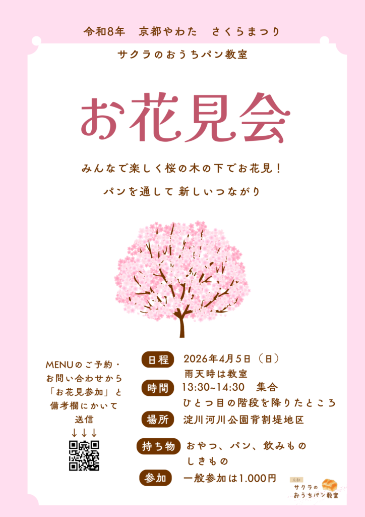 ▶️2026サクラお花見会のお知らせ 2026 3/22 イベント案内 ニュース 2026年3月22日 イベント案内 ニュース よかったらシェアしてね! URLをコピーしました! URLをコピーしました! ▶️フタ付き食パンプライベートレッスンチョコレート入り角食パン 関連記事 ▶️フタ付き食パンプライベートレッスンチョコレート入り角食パン 2026年3月15日 ▶️サクラペア体験 カップルやご夫婦で。パンを作ってお花見へ 2026年3月9日 ▶️高槻出張教室4月 フライパンで焼けるチーズパン作りご案内 2026年2月20日 ▶️高槻出張教室tanaka coffee 様 2月フライパンであんぱんつくり こっちの方が好き!!とのお声!開催レポです 2026年2月19日 ▶️プレスリリースの様子が、商工会youtubeで公開。こちらからクリック↓ 2026年2月14日 ▶️サクラメソッド2026 自信の焼き色三ヶ月伴奏プログラム 春限定! 2026年2月13日 ▶️【初級・体験可】3月あんぱんつくり体験 2026年2月9日 ▶️ 3/29(日)そのままプレゼントできるパンつくり企画です! 2026年2月9日 コメント コメントする コメントをキャンセルコメントを投稿するにはログインしてください。